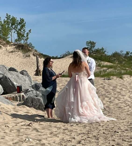 My partner and I wanted to elope but being more family oriented we opted for a small ceremony. We planned a small ceremony out at Ludington State Park which was so magical and beautiful. Looking for a officiant led us to Sarah and she is amazing! She made everything so easy, and since we had a short engagement she helped everything go quickly! Flexable, and wonderful with communication. She is so kind and understanding, I love her energy and her vibes she gives, it was exactly what I had wanted for our officiant. My partner and I are not very tradtional and it made me so happy to be able to include that part of ourselves in our ceremony. We have talked about doing a vow renewal when the time comes I know we will be reaching out! Thank you Sarah for being so flexable and wonderful!